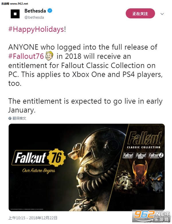 今天,B社官方在Twitter宣布,只要在2018年购买《辐射76》的玩家便可在明年1月初收到他们送出的《辐射》经典合集。