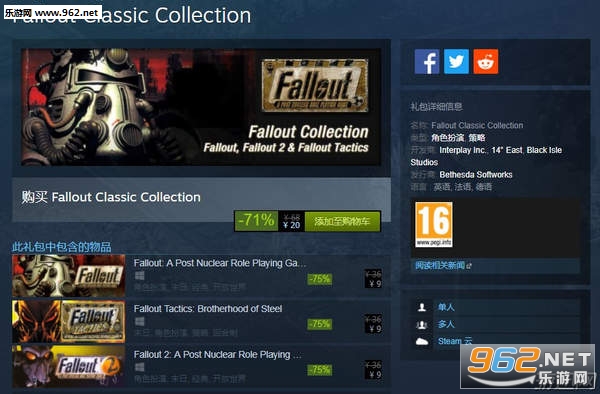 《辐射》经典合集包括《辐射》《辐射战略版:钢铁兄弟会》以及《辐射2》,目前该合集在Steam的折扣价为20元。