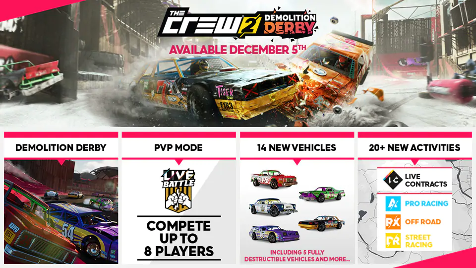 育碧官网今日发出消息《飙酷车神2》马上就要迎来第二个重大的免费更新了,新的“撞车大赛”模式即将在12月5日上线。这次更新不光会带来“撞车大赛”更添加了2种新的竞技场供玩家在里面“肆意驰骋”,育碧还专门发布了预告视频一起去看看吧!
