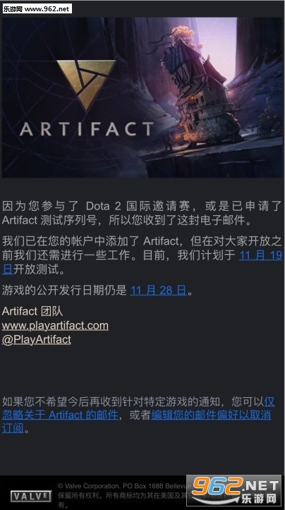 近日有玩家收到来自V社的通知,通知内显示DOTA2卡牌游戏《Artifact》将于11月19日开启Beta测试,游戏正式发售日期为11月28日。