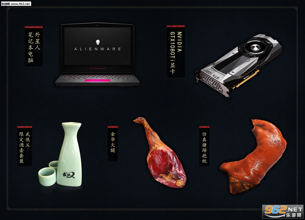 成功参与预约购买《武侠乂》即可参加每日抽奖活动,每日可获得一次抽奖机会,次数不叠加。外星人笔记本电脑、1080Ti显卡、游戏限定酒壶套装、仿真猪蹄抱枕……每天都有机会把它们带回家,中奖率百分百!