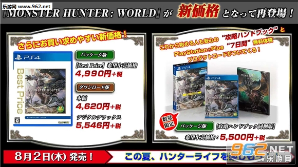 CAPCOM宣布将在7月26日推出PS4《怪物猎人 世界》超值优惠主机套装,价格32980日元(不含税,约合人民币1960元),此外《怪物猎人 世界》PS4廉价版将在8月2日发售,实体标准版售价4990日元(不含税,约合人民币297元)。而腾讯WeGame版《怪物猎人:世界》也传言在8月2日发售。