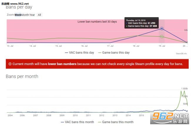 根据SteamDB统计,周三一共有28407个账户被封禁,周一和周二分别为1274和1202,今年也成为V社封号最多的一年,光今年6月份就已经有十万个账户被封禁。