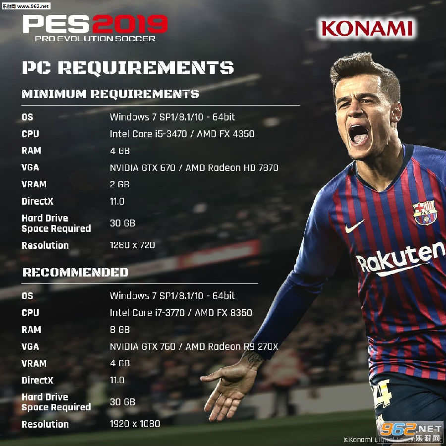 Konami刚刚公布了《实况足球2019》的官方PC系统需求。根据官方推荐配置,似乎本作的PC版优化“很良心”,老显卡GTX 760便可满足1080P画质。