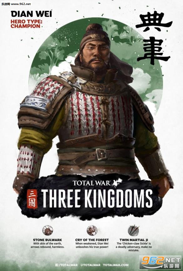 根据人设图介绍,典韦拥有三项技能:坚如堡垒(Stone Bulwark)、山林怒嚎(Cry of The Forest)、 双戟(Twin Martial Ji)。坚如堡垒:皮肤坚硬化,典韦可以反弹箭矢,使其伤害无效化。山林战嚎:怒吼加强伤害。双戟:双戟精通。