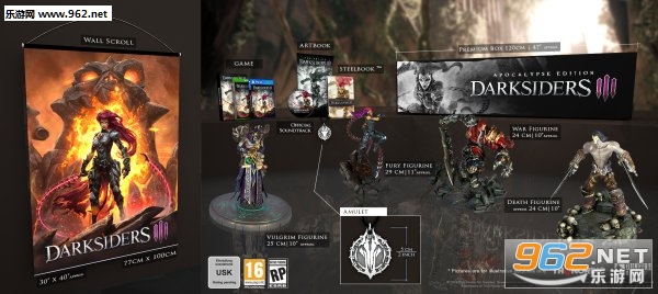 启示录版包含游戏本体,铁盒、艺术画集、原声音乐、独占装备DLC。还包含限定包装、30x40英寸的壁挂卷轴,2英寸护身符项链,另外还有4座雕像:Fury(11英寸)、War、Death、Vulgrim (后三者为10英寸)。