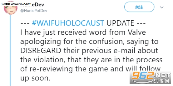 该事件在推特和论坛讨论得沸沸扬扬后,面对舆论压力,日前,V社又不得不再次告知这些厂商,撤回前两天的警告邮件,同时取消了游戏内容的整改期限。