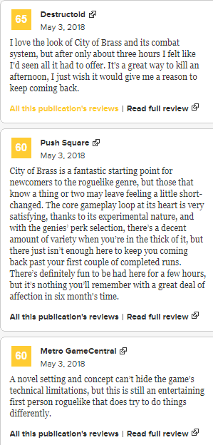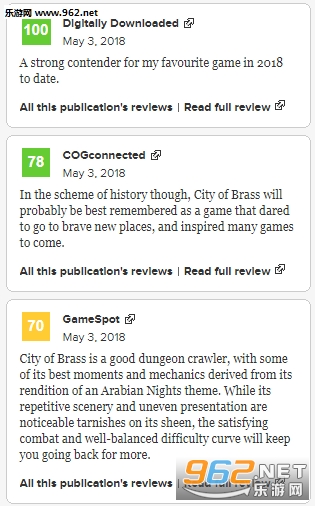 国外权威评分网站Metacritic今天发布了《黄铜之城》首批评分,一共有6家权威媒体对这款游戏进行评分,目前这款游戏的平均分为69分,表现尚可。《黄铜之城》是一款由Uppercut Games开发的第一人称动作冒险游戏,灵感来源于《一千零一夜》,游戏开发者曾开发过神作《生化奇兵》。游戏目前已经登陆Steam,支持简体中文,售价78元,在Steam的总体评价为特别好评。