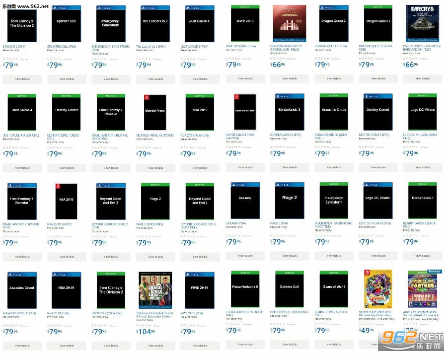 在沃尔玛加拿大官方商城的游戏预购区,添加了大量未公布的游戏新作,虽然该页面很快被撤掉,不过玩家们早已截图为证。除了上面提到的游戏之外,还有《NBA 2K19》、《WWE 2K19》、已经发布的《全境封锁2》、《任天堂明星大乱斗》,剩下的《狂怒2》、《刺客信条》、《极限竞速:地平线5》、《正当防卫4》、《乐高DC恶棍》、《勇者斗恶龙2》这些游戏都是此前几乎没有任何消息的新作。