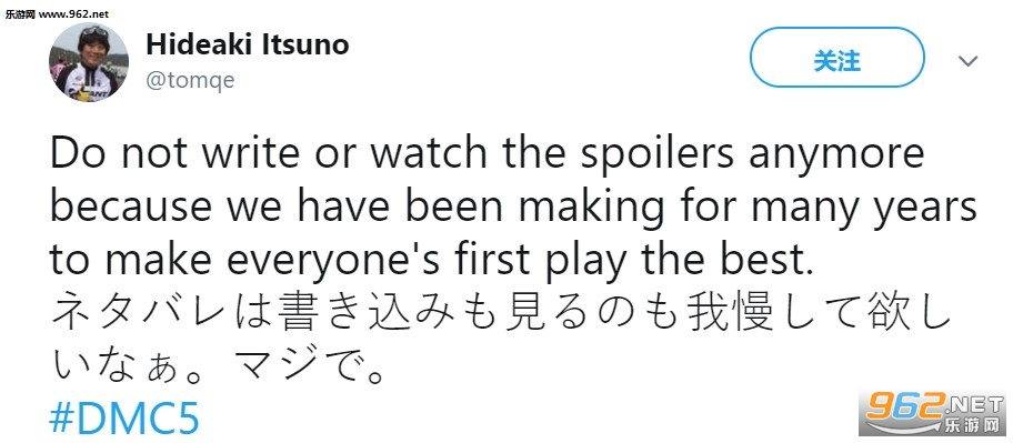 18个小时前,伊津野英昭亲自在Twitter上表示,《鬼泣5》距离发售还剩下5天,那些计划购买《鬼泣5》的玩家现在应该考虑避一避网上的剧透了。6个小时前,他本人又在Twitter上呼吁玩家,不要在网络上发布剧透帖子或观看剧透视频,因为制作组已经辛苦开发了多年,很想保证每个人的第一次游玩体验是最好的。