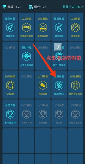 2. 登录并查找功能:登录后在等级特权等页面找“酒店防**”功能。