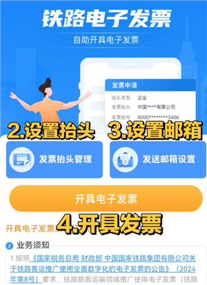 开具流程:登录铁路12306账户;进入电子发票开具页面;;输入购买方名称、统一社会信用代码等信息(如为企业报销所需);系统根据旅客提供的信息生成电子发票,并通过铁路12306下载或以电子邮件等方式交付给旅客